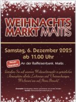 Stimmungsvoller Weihnachtsmarkt in gemütlicher Atmosphäre und allerlei Leckereien und Überraschungen an der Raiffeisenbank in Maitis. Unser Albglüher wird dort vom Baukarren Maitis ausgeschenkt.